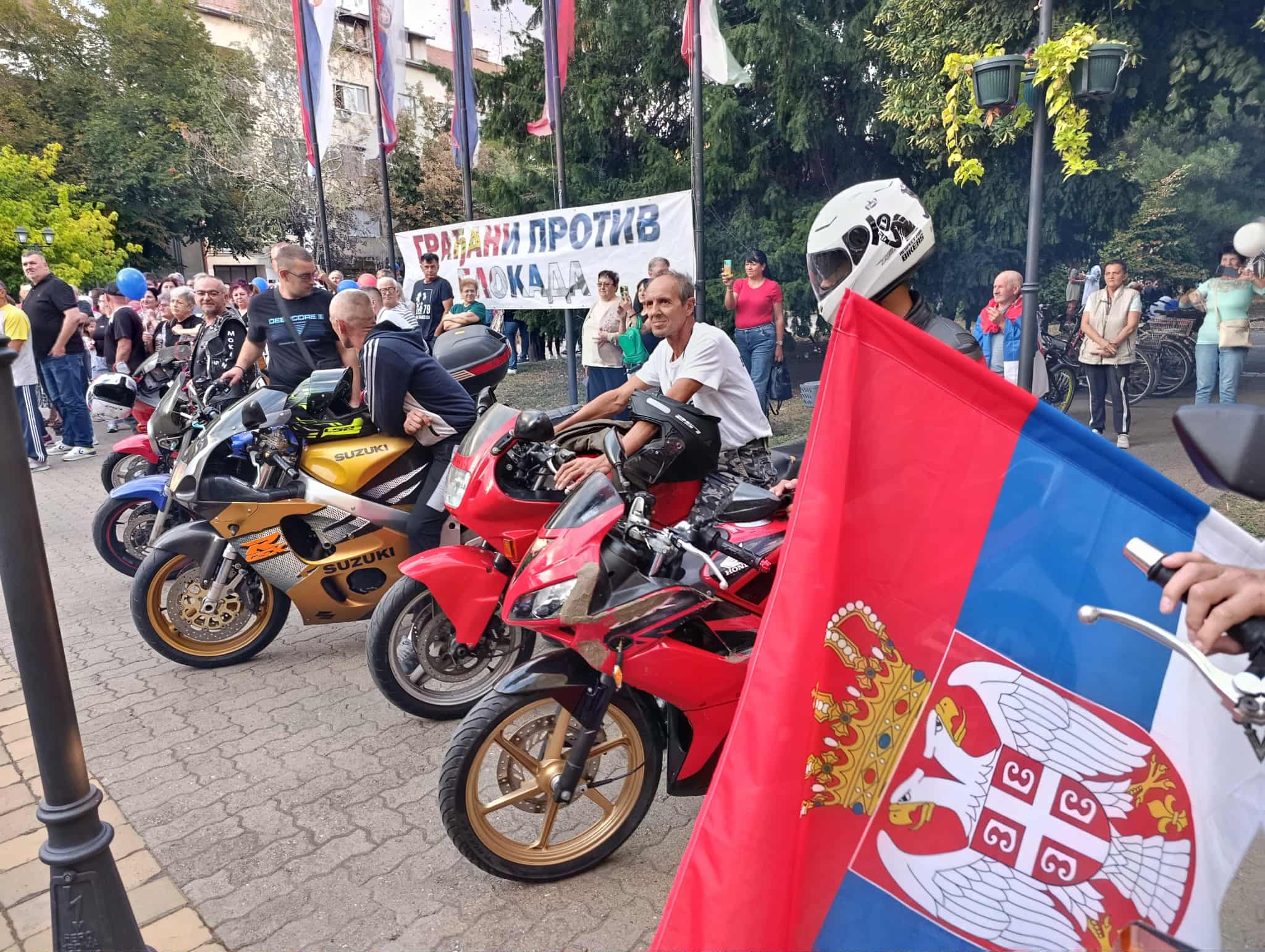 Окупљање је протекло под паролом „Не дамо Србију“ – овај транспарент грађани су развили испред Градске куће, а на скупу су били и ветерани који су, заједно са суграђанима, донели тробојку, као и бајкери из нашег града.