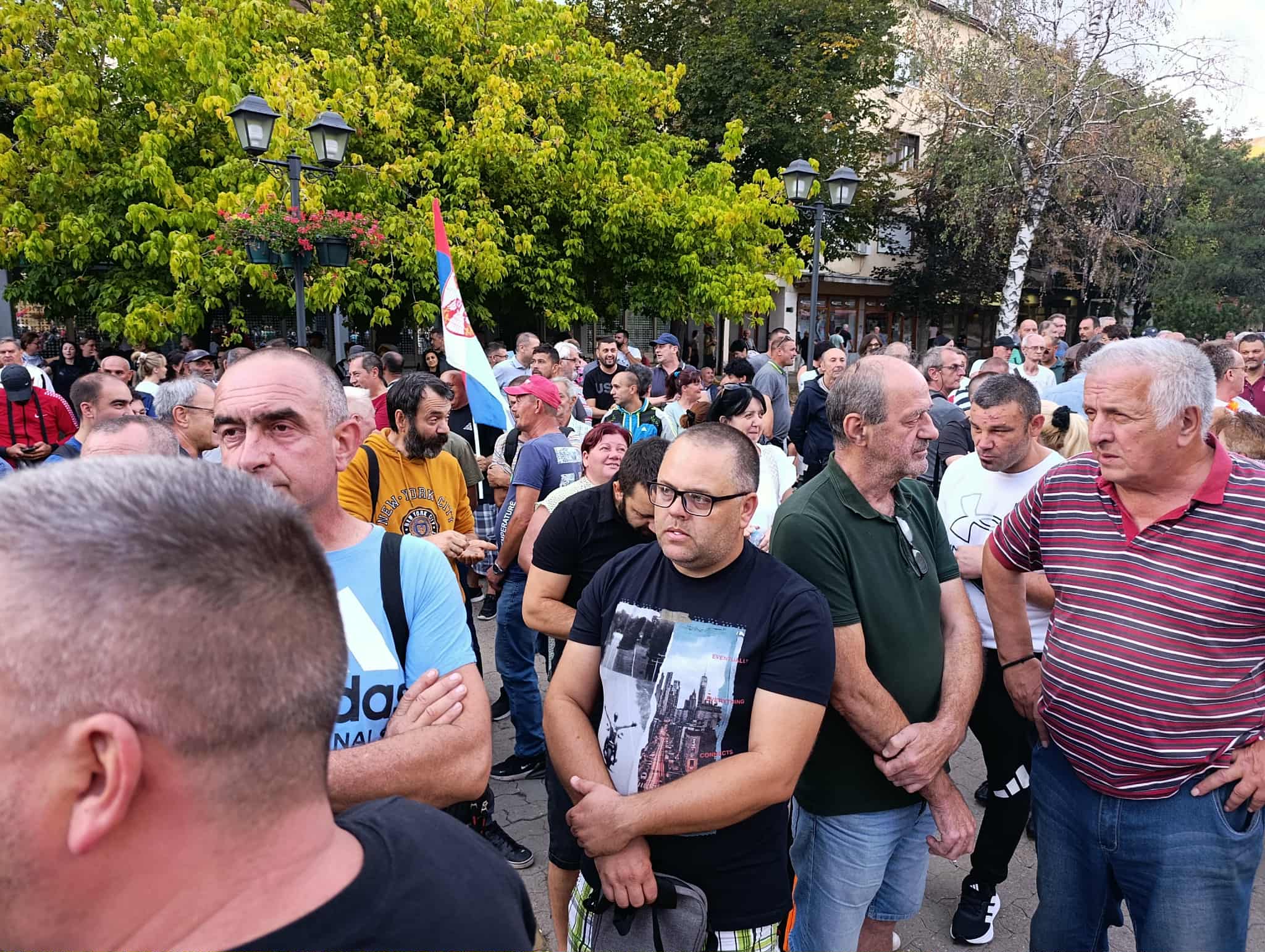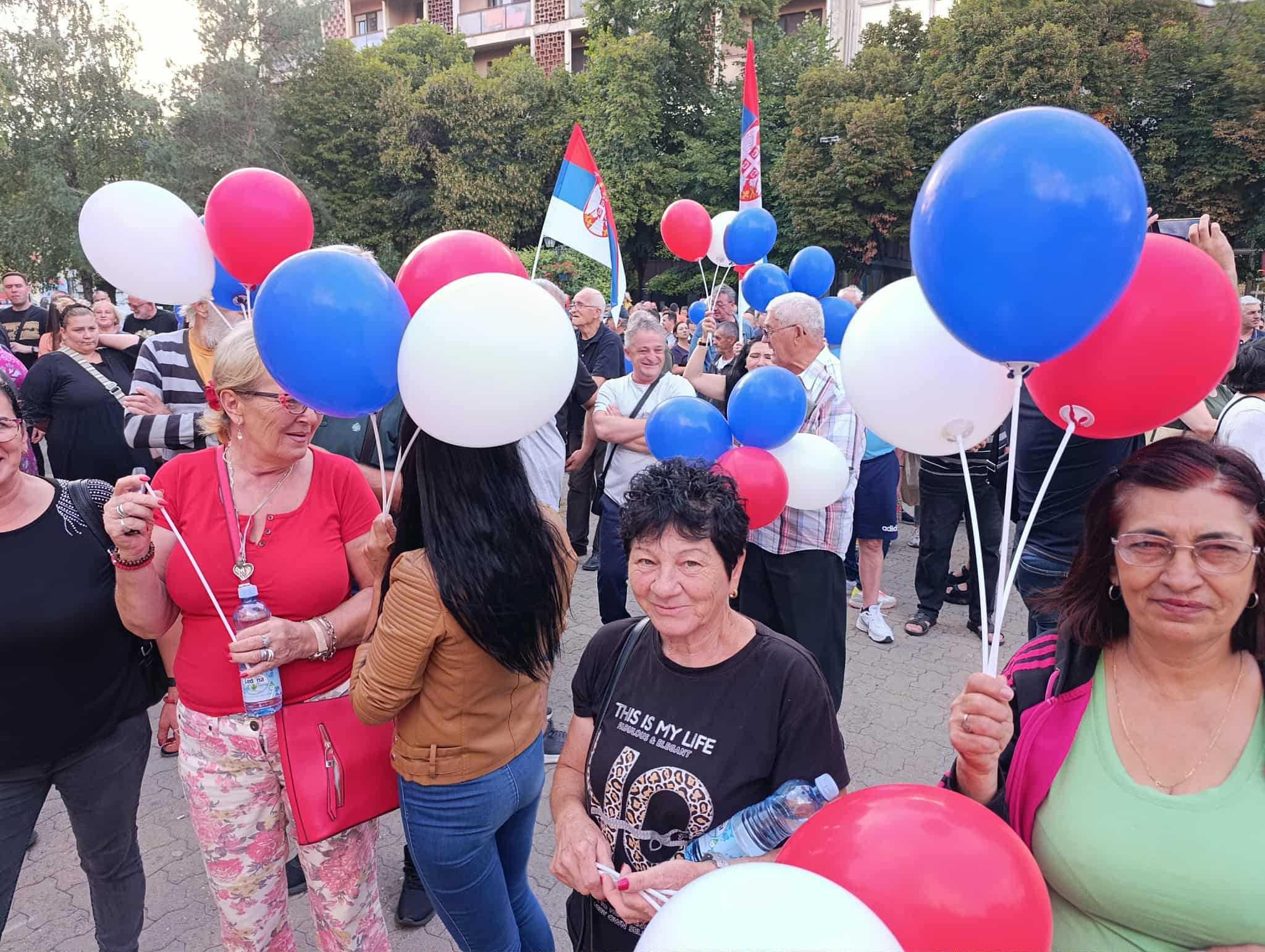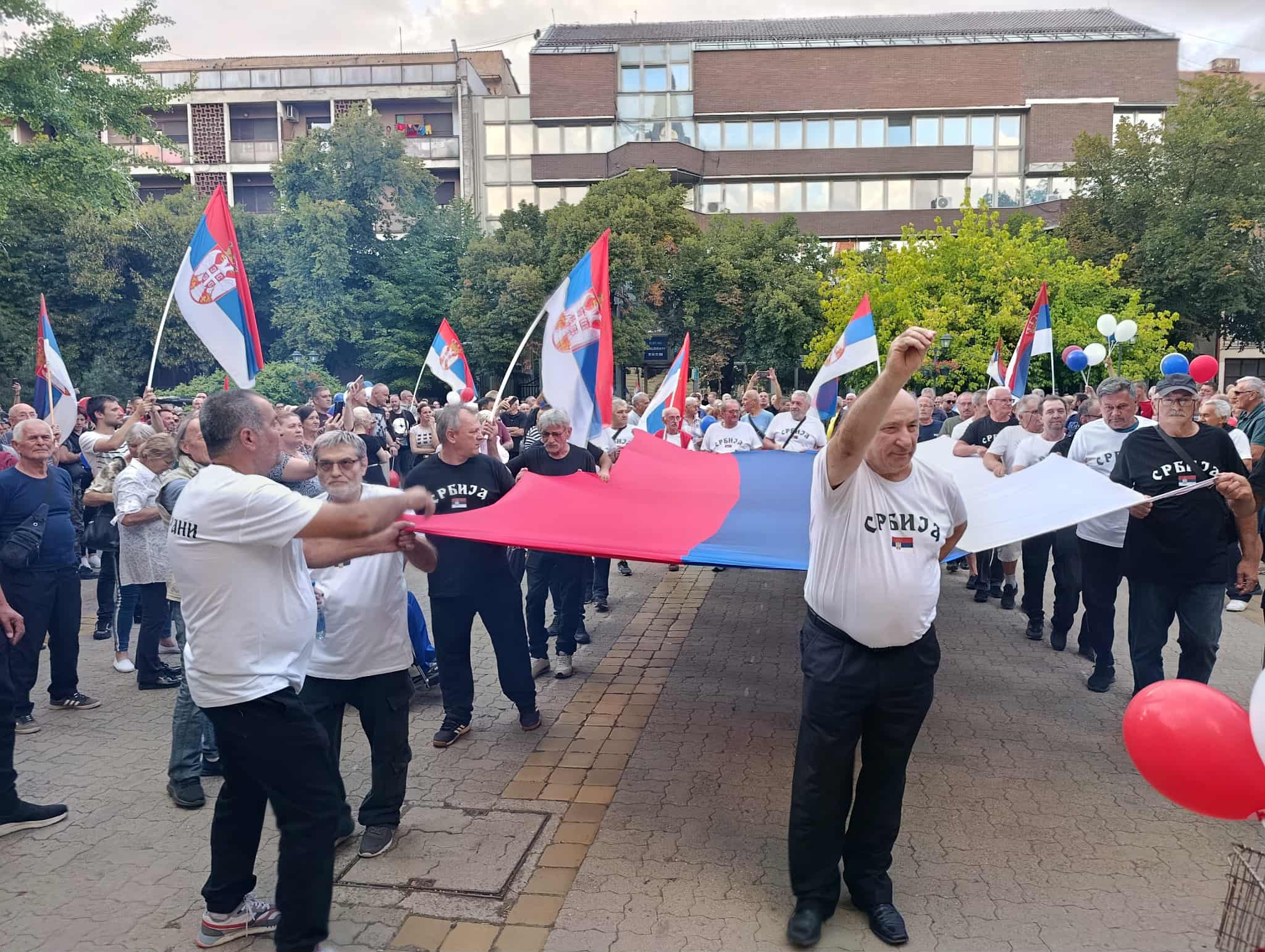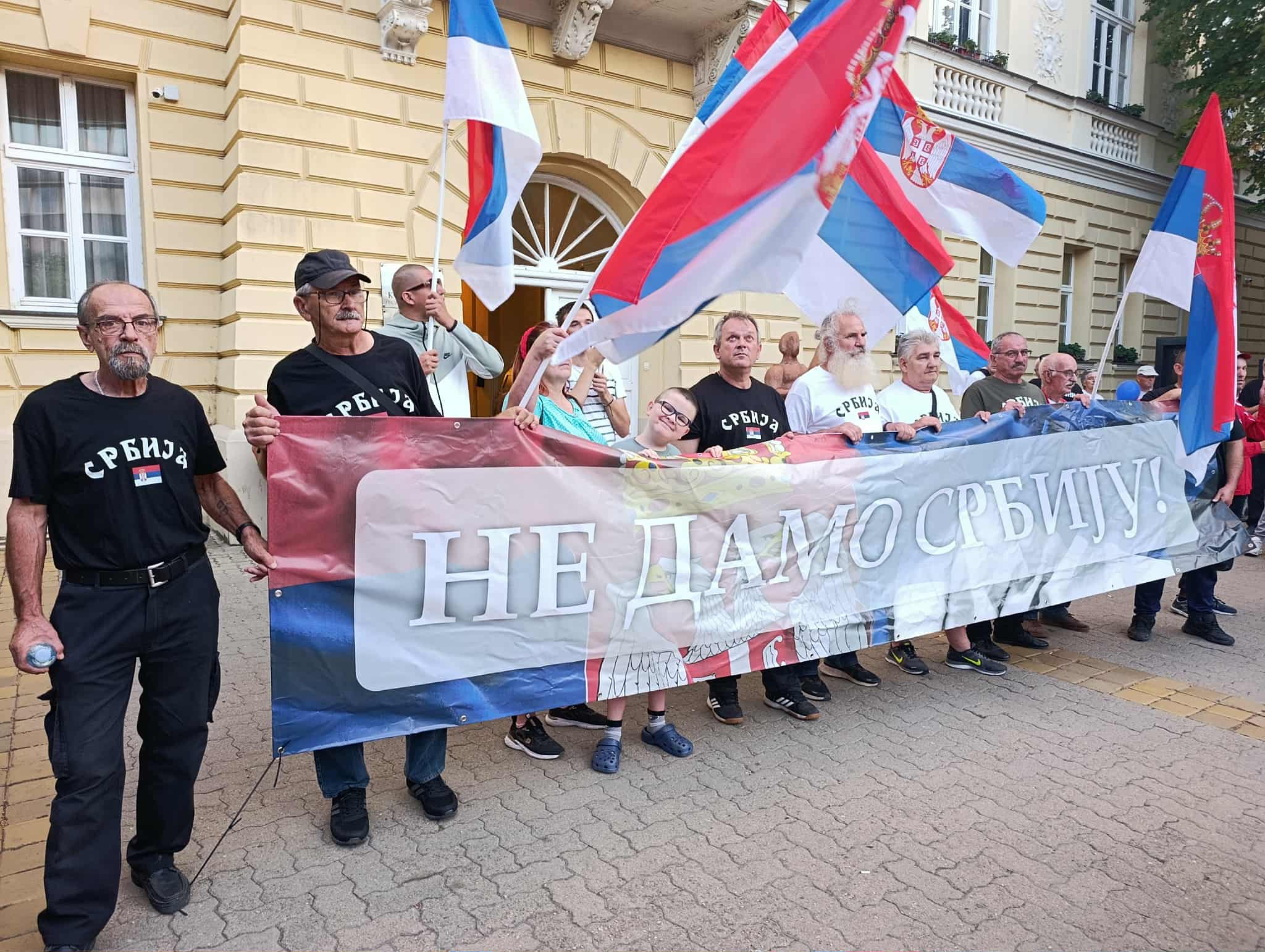 Окупљање је протекло под паролом „Не дамо Србију“ – овај транспарент грађани су развили испред Градске куће, а на скупу су били и ветерани који су, заједно са суграђанима, донели тробојку, као и бајкери из нашег града.