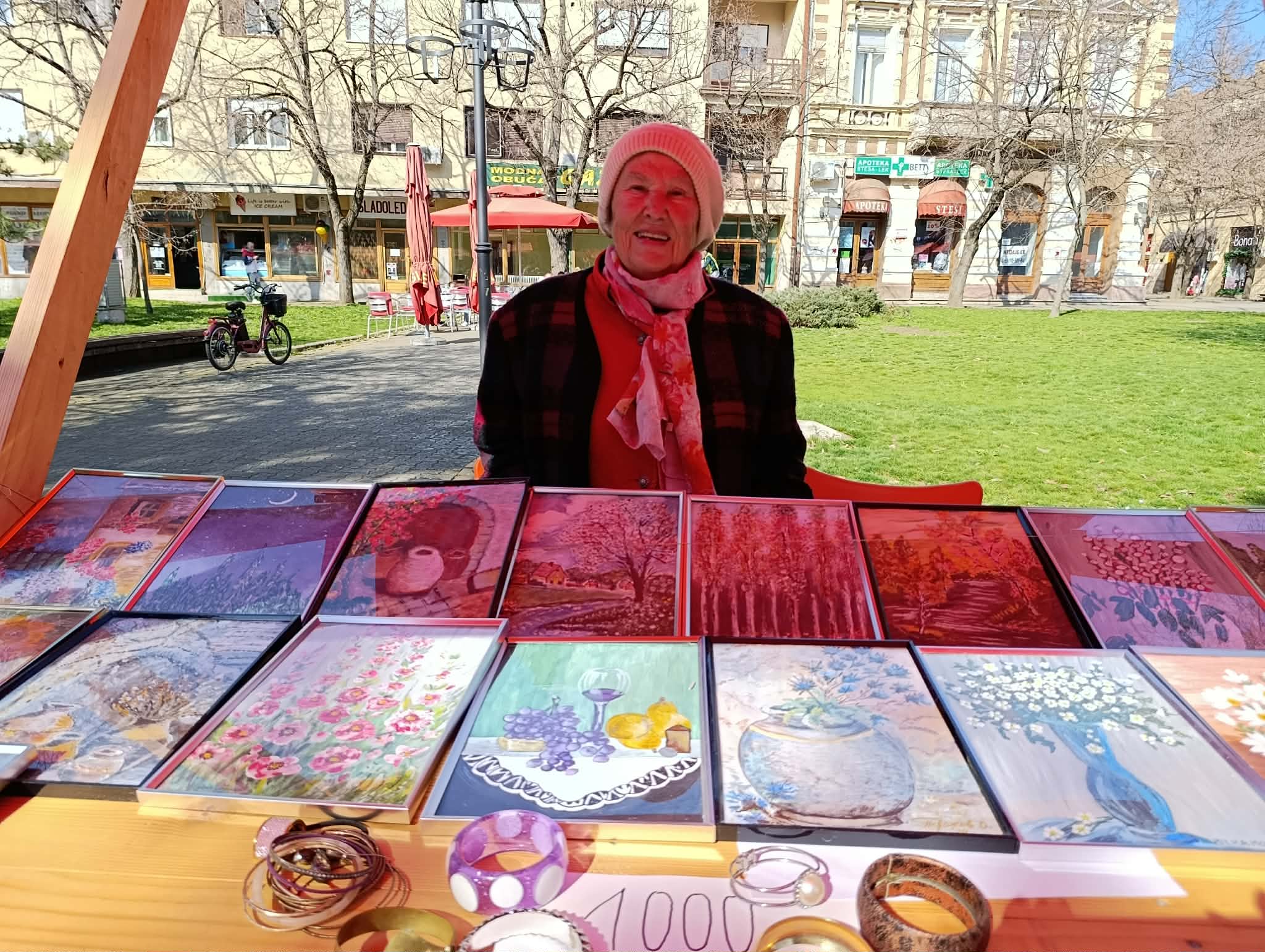 -Специјално за овај базар урадили смо слике које смо урамили. У припреми је учествовала већина чланица, а мотиви који се налазе на мини акварелима су природа и цвеће. Исто тако припремили смо цветове од разних материјала за удружење пензионера. По традицији ми ћемо Дан жена провести у нашим просторијама, а наши чланови уручиће свакој присутној дами по један цвет. Пуно нам значе базари и могућност да излажемо с обзиром на то да сав новац који добијемо уложимо у куповину материјала – истакла је Анђелка Јовановић из КУД-а „Сунчана јесен“.